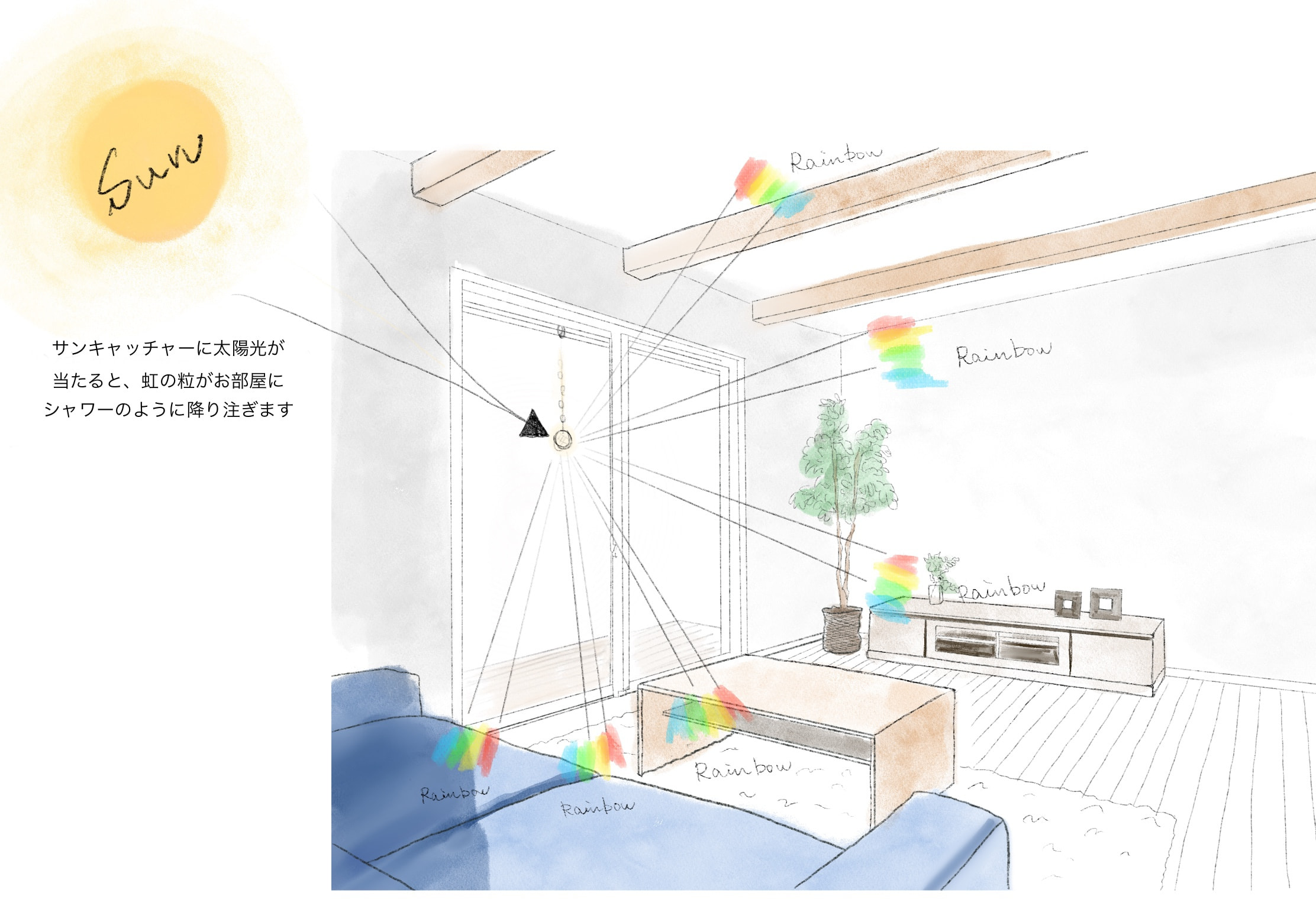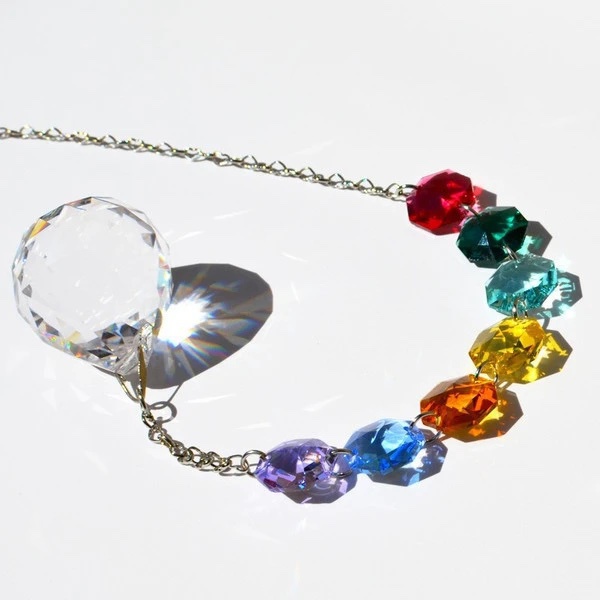 クリスタル製のガラス玉を使いストラップのように作成したものを窓辺など太陽の光が直接当たる場所にぶら下げると、クリスタルで乱反射した光が虹の粒となって部屋に入ってきます。