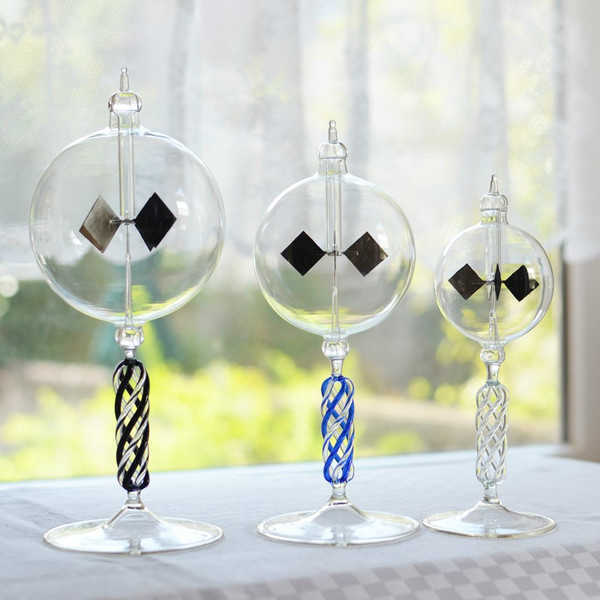 それにより、黒い表面上に起こる熱が高圧力を発生させ、白い表面上に起こる力を上回り、その力の差に よってガラス球の内部で回転します。